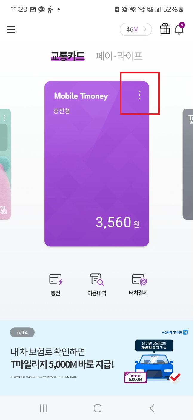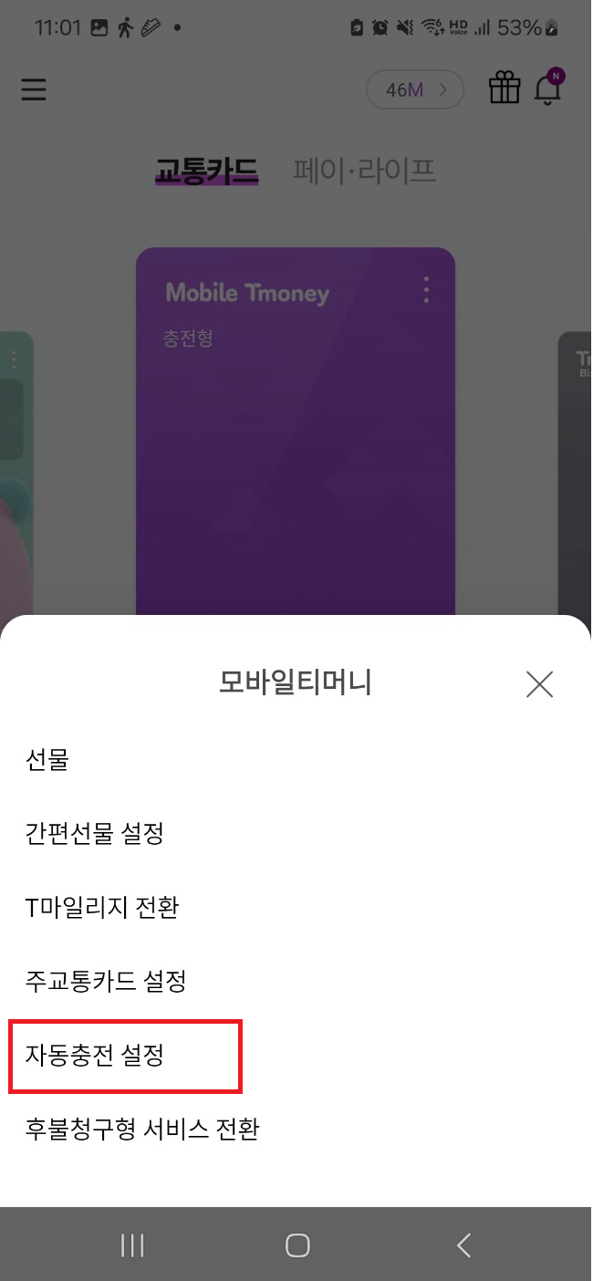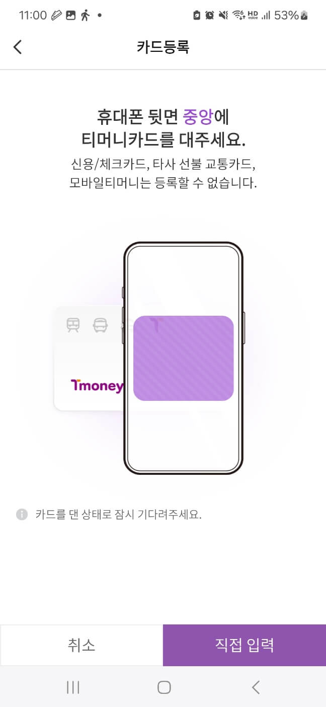 카드등록은 어렵지 않아서 기존 교통카드를 핸드폰 뒷면 중앙에 대시면 자동으로 카드를 등록할 수 있습니다.