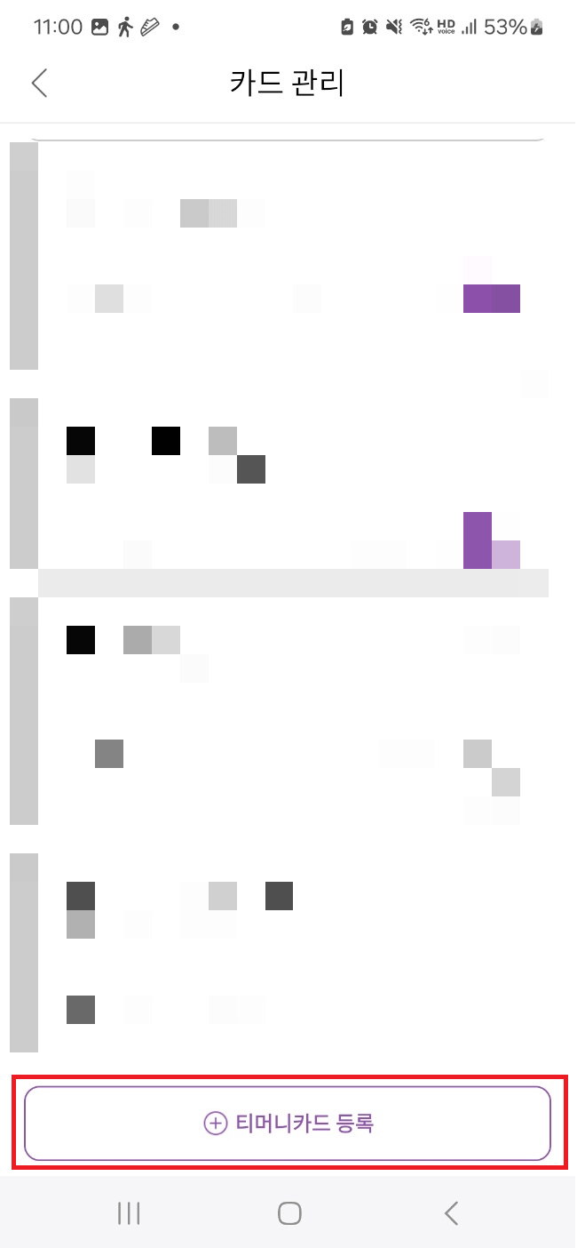 클릭해 주시면 내 카드 관리탭에서 카드 관리탭을 클릭해 주시면 등록된 교통카드가 나오는데 처음 사용하시는 분들에게는 카드 관리 앱이 없으실 겁니다. 화면 하단에 보시면 티머니 등록이 있을 건데 선택을 해서 카드를 등록해 주시면 됩니다.