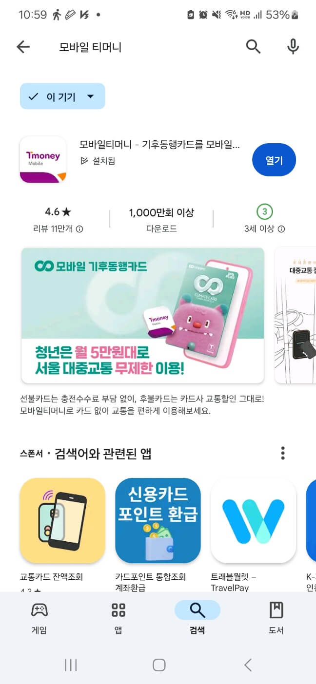 플레이 스토어에 들어가서 모바일 티머니 앱을 설치를 합니다.