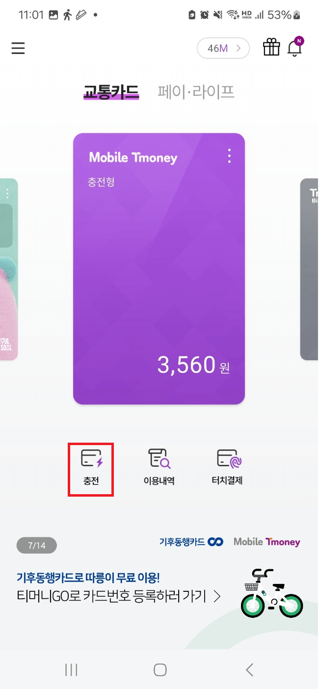 카드 등록이 완료 됐다면 충전을 하면되는데 메인 화면에 모바일 티머니 (충전형)이라고 있는 부분이 있을 겁니다. 카드 형태로 나와있고 카드 모양 하단에 보시면 충전이라는 글이 보이실 겁니다. 충전을 눌러주시고 카드에 자동으로 결제할 수 있는 카드를 등록하여 등록한 카드에 잔액을 충전하여 사용하면 됩니다.