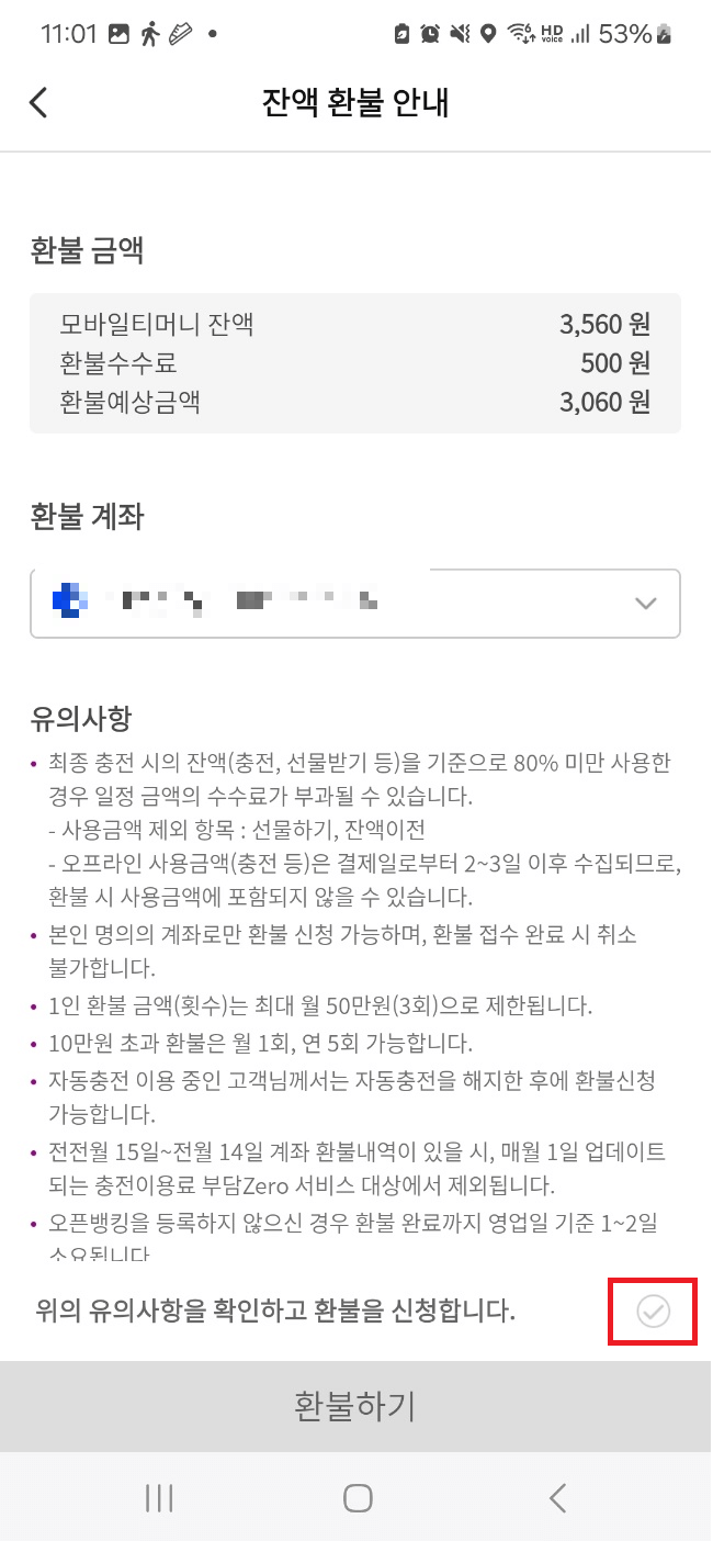 유의사항을 확인하고 환불을 신청합니다.라고 뜨는 내용을 선택한 후 환불하기를 눌러 환불을 받으시면 됩니다.